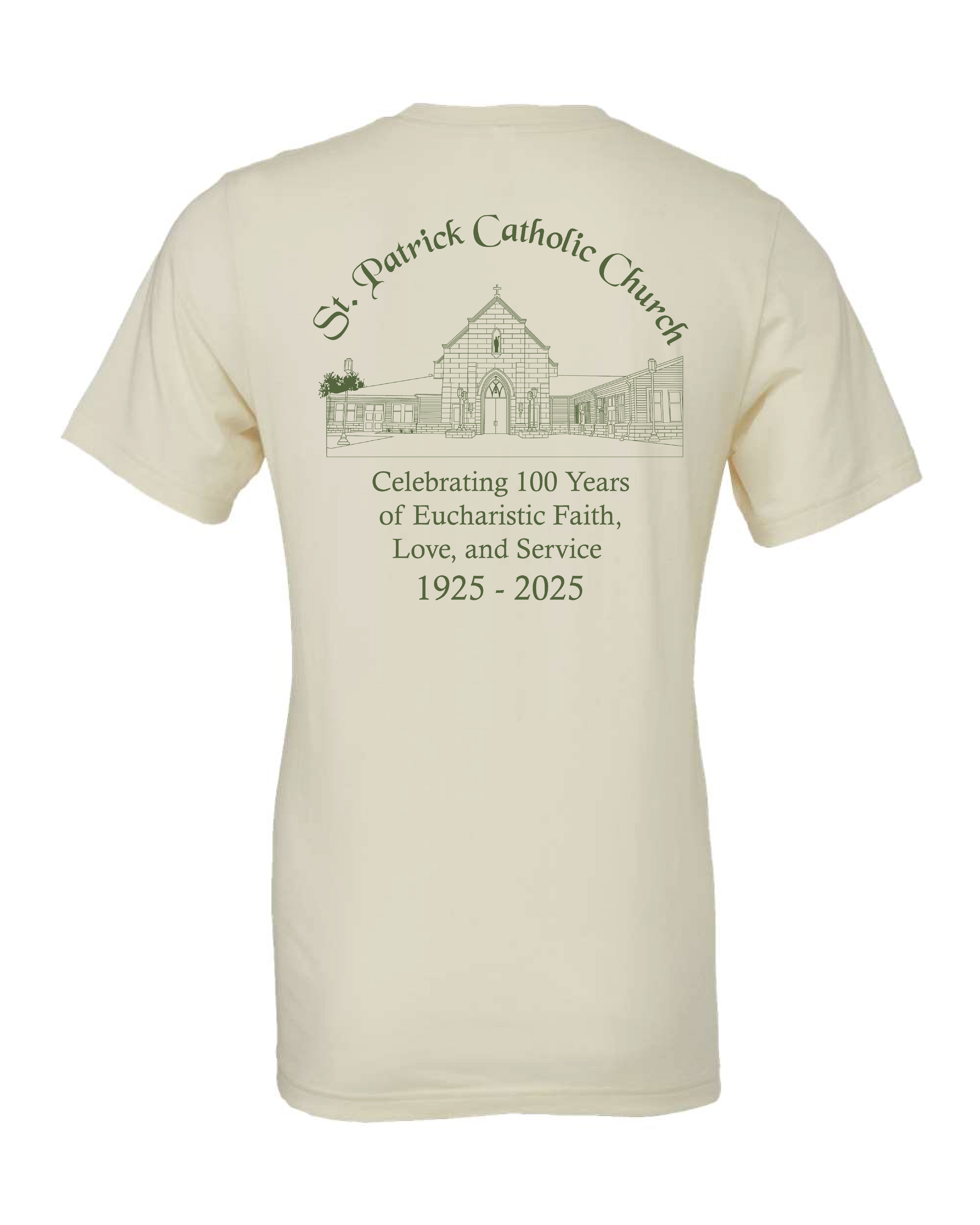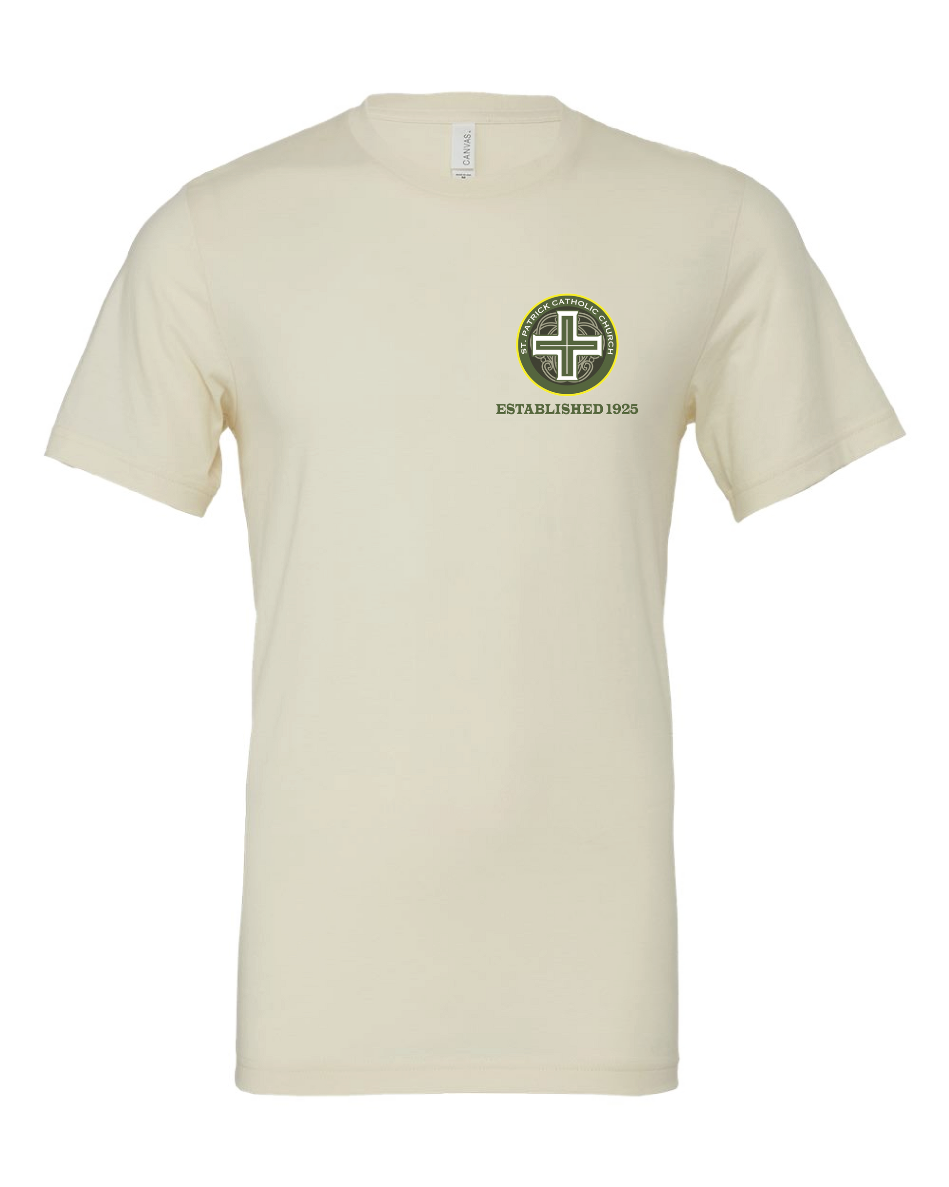 The image on the back of the garments is printed to match the green in the Saint Patrick's Catholic Church logo.