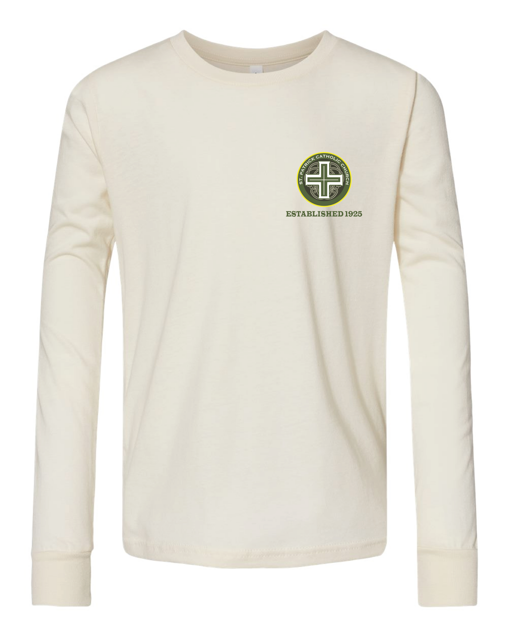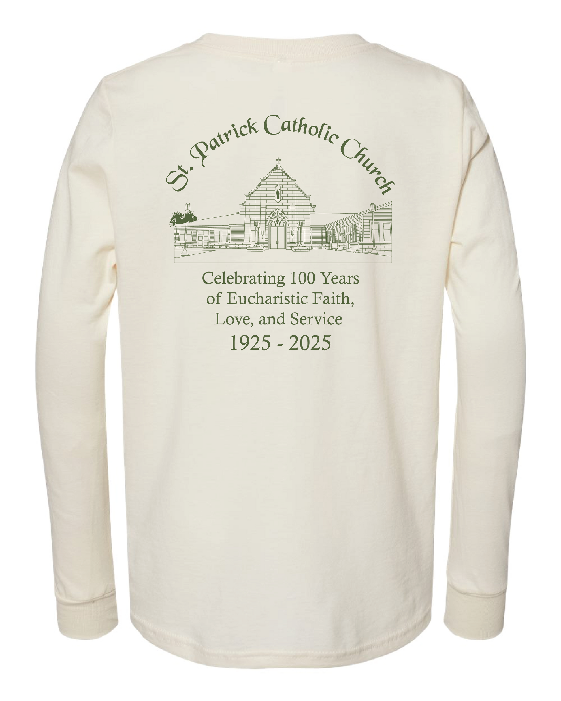 The image on the back of the garments is printed to match the green in the Saint Patrick's Catholic Church logo.