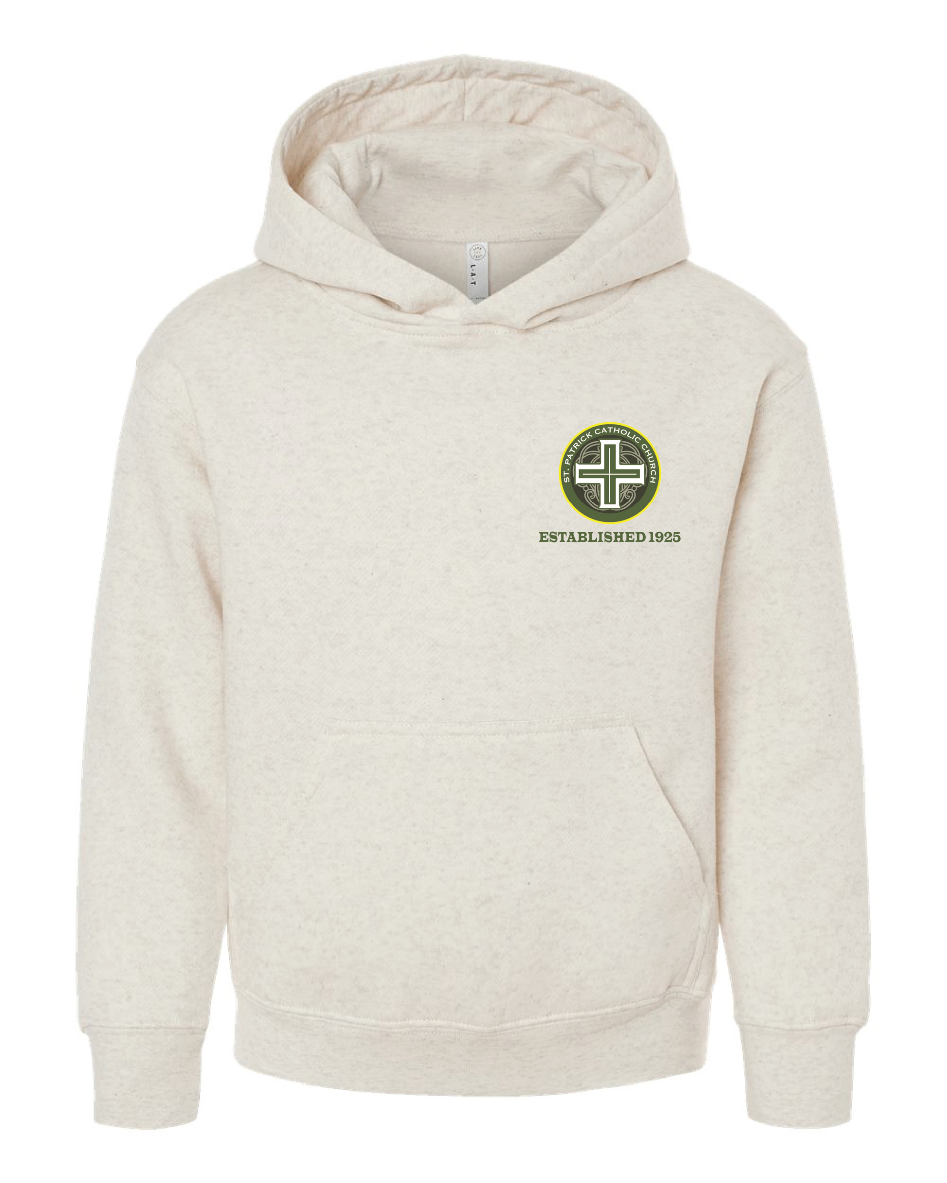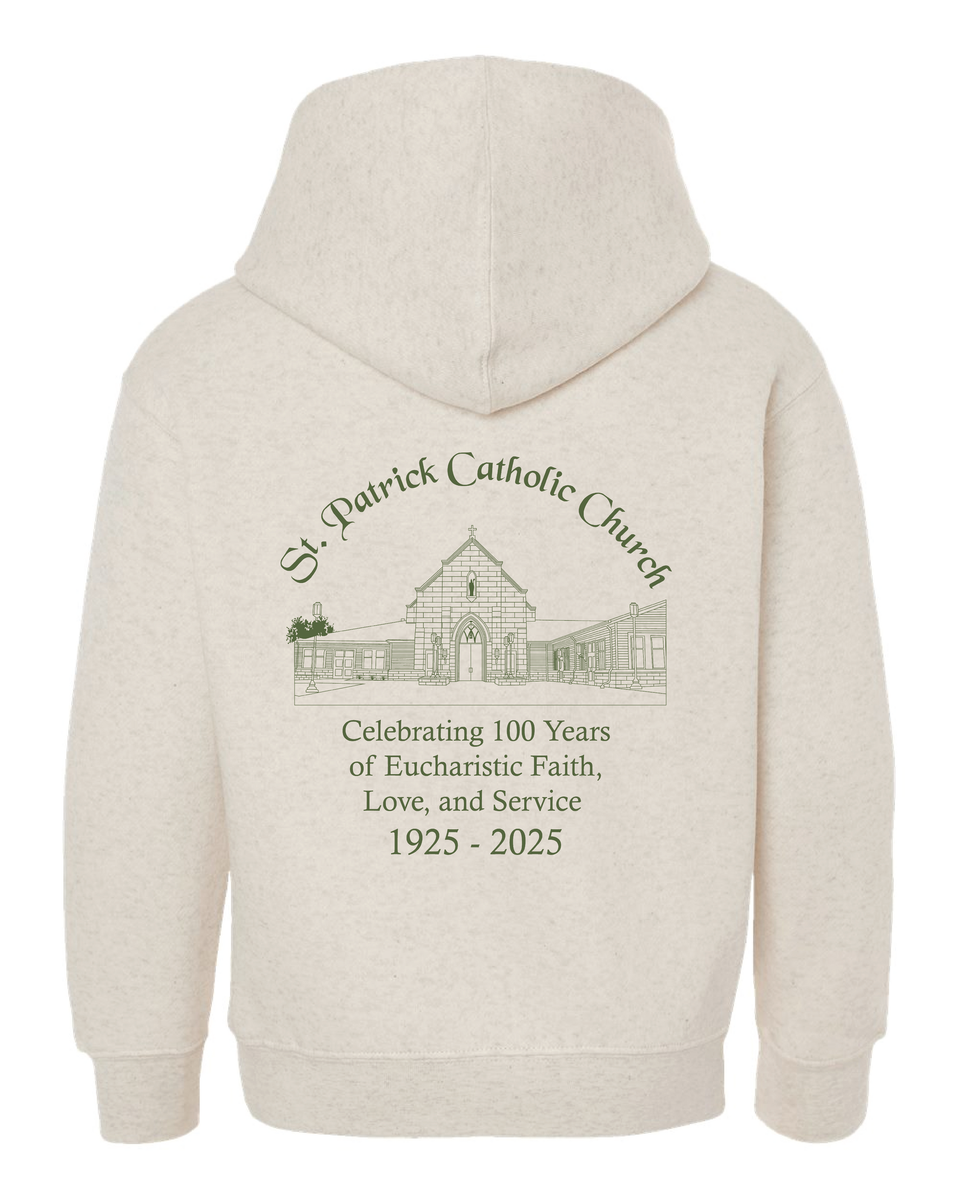 The image on the back of the garments is printed to match the green in the Saint Patrick's Catholic Church logo.